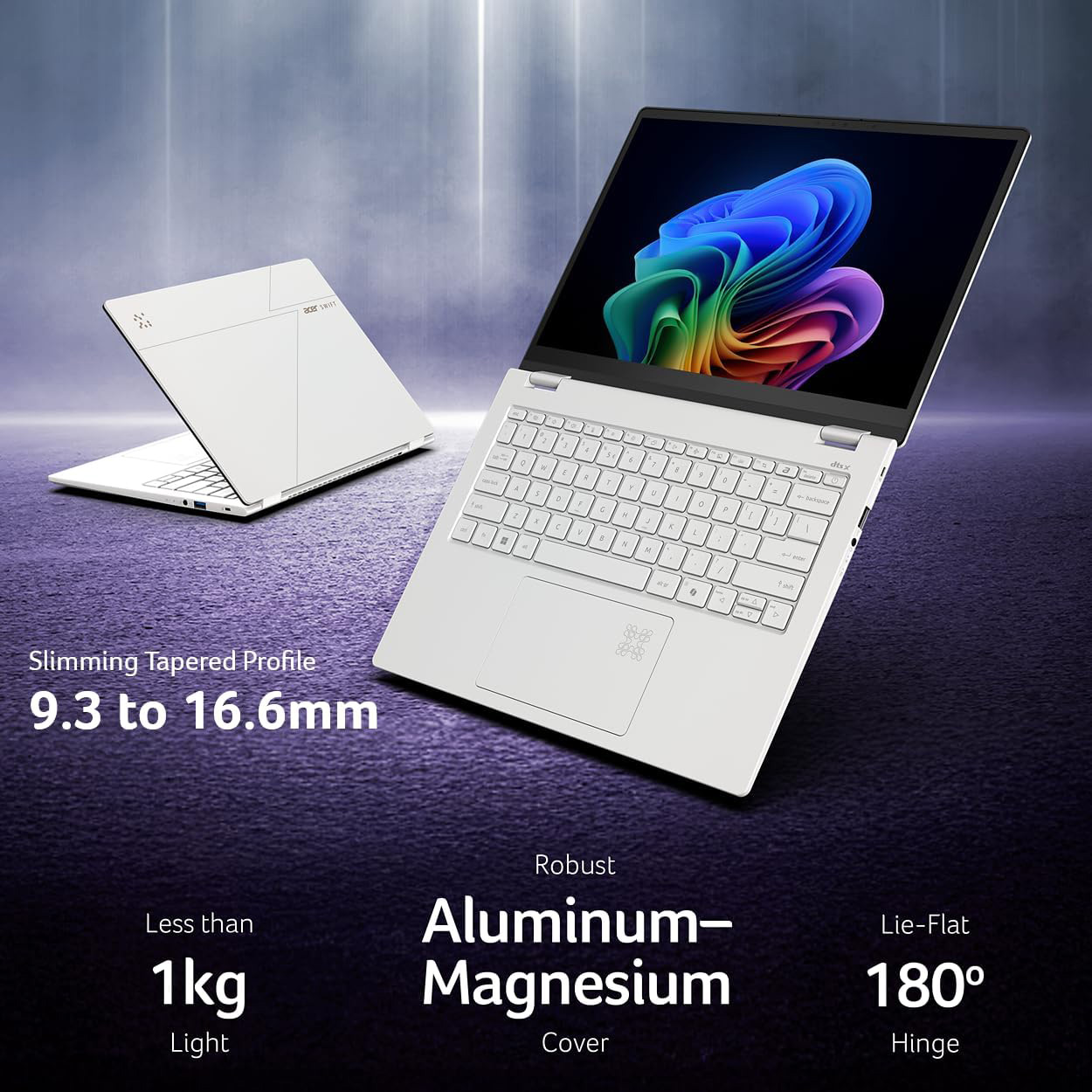 Delgado. Ligero. Impresionante: Fabricado con magnesio y aluminio premium y con un peso de 2.2 libras. La IA Swift Edge 14 combina portabilidad con fuerza. Desde el teclado suave al tacto con revestimiento UV hasta la bisagra flexible de 180 grados, cada detalle equilibra belleza y durabilidad. Su perfil cónico mide 0.366 in en su punto más delgado a 0.654 in, con un diseño elegante pero resistente que se ve tan bien como funciona.