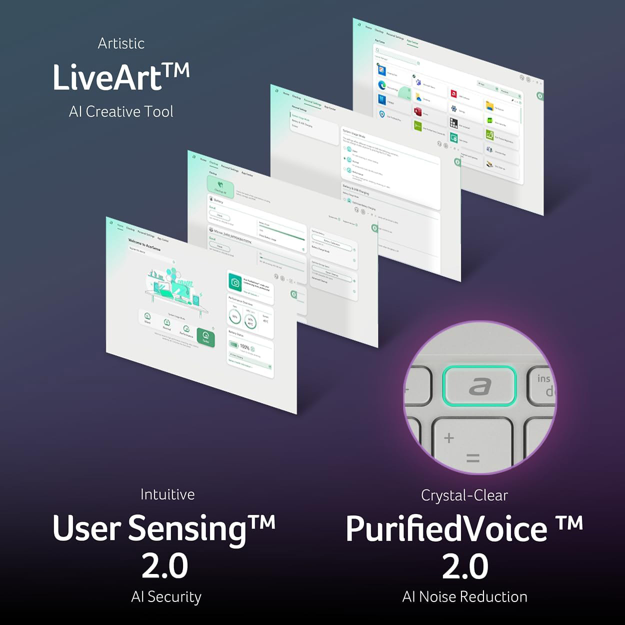 Mejores videollamadas en cualquier lugar: Acer QuickPanel está diseñado para ser intuitivo. Aparece automáticamente cuando su dispositivo detecta que su cámara web o micrófono se ha encendido. La cámara web FHD IR de 1080p y las herramientas de conferencia mejoradas por IA de Acer en Acer PurifiedView 2.0 y Acer PurifiedVoice 2.0 trabajan juntas para garantizar que se vea y suene lo mejor posible cuando se comunica en línea. Mejora tus condiciones de iluminación. Difuminar el fondo. Elimina las distracciones ruidosas.
