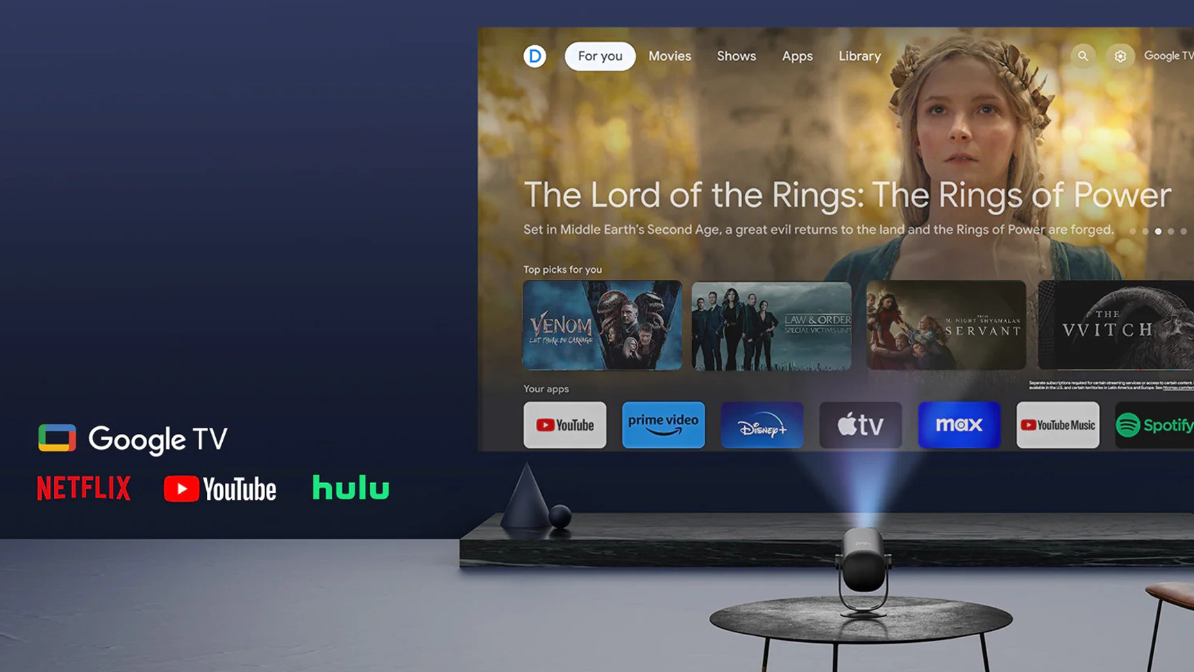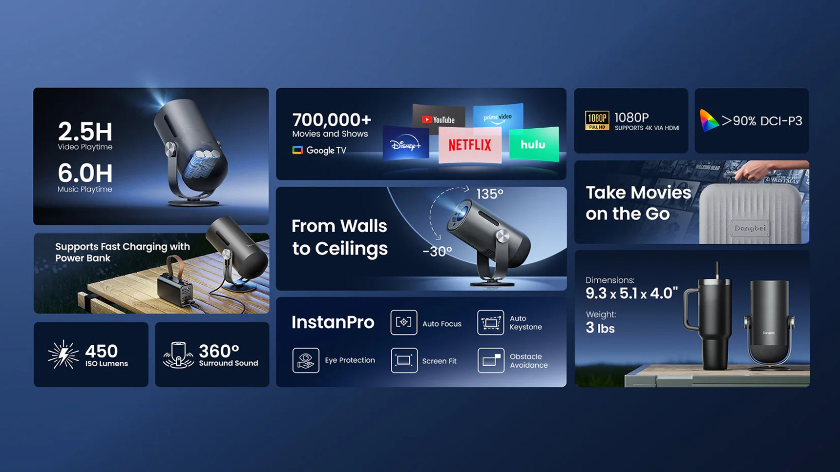 Super Portable Cinema: ¡Vaya libre con nuestro primer proyector ultraportátil! Mira una película de 2,5 horas o fiesta toda la noche con música con una sola carga. Compatible con banco de energía. Claro y vívido: Experimente imágenes impresionantes con 450 lúmenes ISO, 1080p y soporte 4K. Más del 90% de cobertura de color DCI-P3 y la opción de temperatura de color calibrada D65 dan vida a los colores. Google TV y Netflix con licencia: ¡más de 700,000 películas y programas esperan! Disfruta de Netflix oficial, fácil transmisión y control por voz en cualquier lugar, todo integrado en este proyector de películas para exteriores. Gran ángulo, tamaño grande: proyecte desde paredes hasta techos con el soporte integrado de inclinación gran angular de 165°, y cualquier tamaño de 40" a 180" para cualquier espacio.