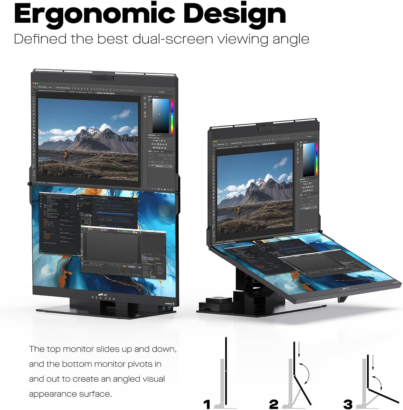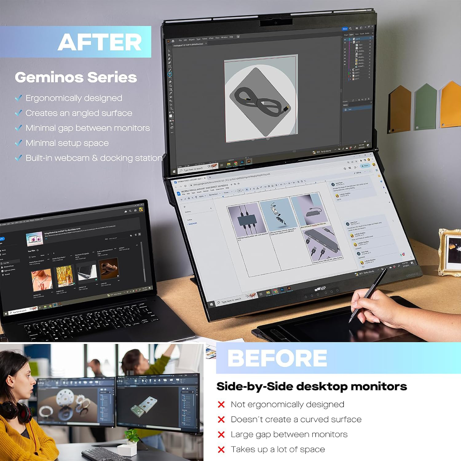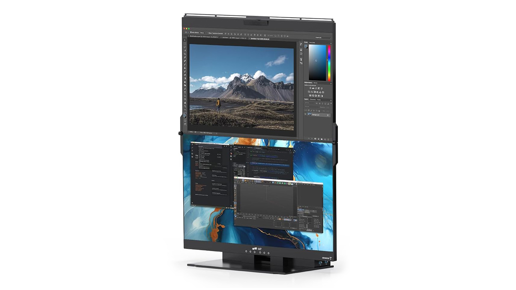 Pantalla táctil altamente receptiva: la pantalla inferior de este monitor de computadora vertical cuenta con un toque de 10 puntos, proporcionando una pantalla táctil altamente sensible y precisa que le permite navegar e interactuar fácilmente con el contenido (no incluye computadoras macOS) Innovadora estación de trabajo todo incluido: Geminos T cuenta con una cámara web 1080P incorporada, un par de altavoces de 3 W, una estación de acoplamiento 10 en 1; la estación de acoplamiento ofrece (2) USB-A, (2) USB-C, (2) HDMI, (1) Ethernet, (1) conector de salida de audio, (1) ranura SD, (1) ranura TF. Diseño ergonómico, fácil de usar: el monitor de computadora plegable se puede inclinar infinitamente con el monitor superior deslizándose hacia arriba y hacia abajo y el monitor inferior girando hacia adentro y hacia afuera, los monitores duales para escritorio son compatibles con una amplia gama de dispositivos.